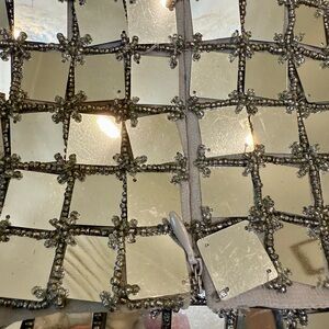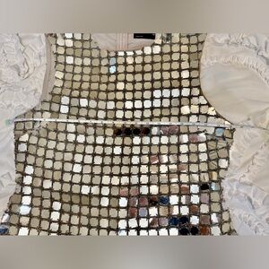 This is a stunner! The sheath dress is all large square sequins connected by beaded threads. The dress is fully lined, sleeveless and zips in the back. It is a heavy dress in that so many beads add to the weight.