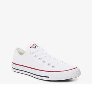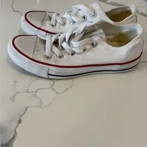 Stylish white canvas sneakers. Features red and blue trim. Timeless Converse style.