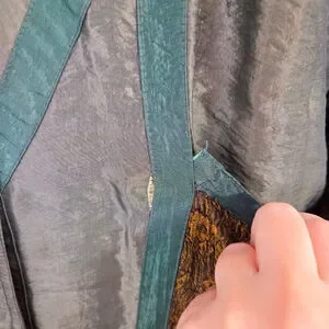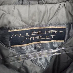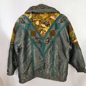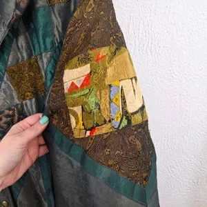 Vintage 80s Mulberry Street patchwork puffer jacket. Dark green shiny satin like material with a mix of patches in different patterns. Metallic gold brocade. Puffy collar. Zip front with snap button placket.
