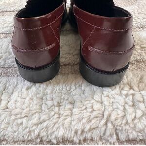 Elegant dark red leather loafers featuring fringe and silver hardware. Ideal for a sophisticated style.