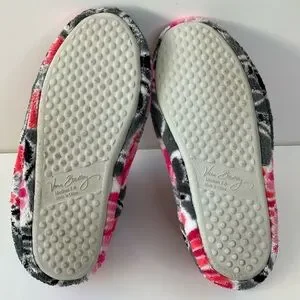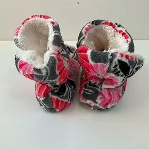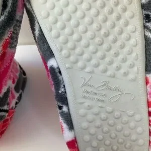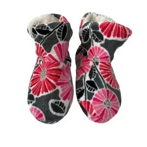 Women’s warm and cozy Vera Bradley soft fleece slipper boots in the retired Cherry Blossom floral pink, red, gray and white pattern with a soft padded footbed. Size 7-8