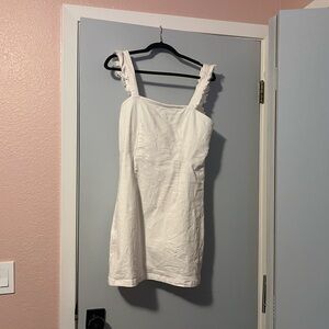 Stretchy mini dress with frayed ruffle straps. Worn and washed once (air dried). No stains.