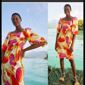 NWT Vibrant linen midi. Statement making puff sleeves. Lined. Side zip. PTP 19