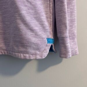 Soft cowl neck sweater in light purple. Features drawstring detail and embroidered logo. In very good used condition