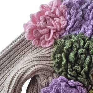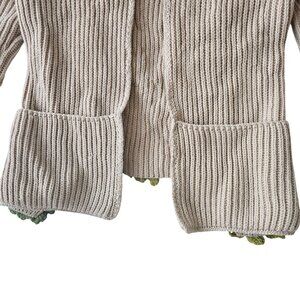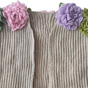 This thick, knit sweater cardigan combines a clean beige knit with vibrant crocheted floral accents, offering warmth and texture. Its open-front design and pockets enhance functionality.