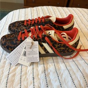 Women’s Adidas Sambas in Leopard print with red laces.