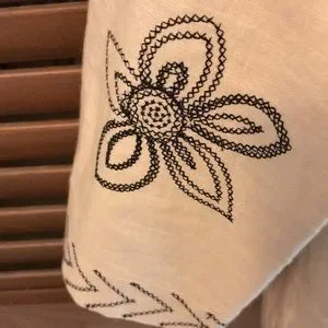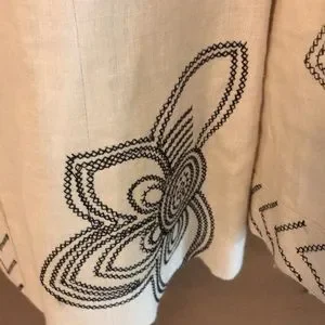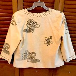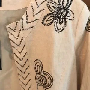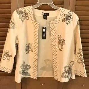Chic linen natural color blazer. Beautiful black stitched floral design & Fully lined.