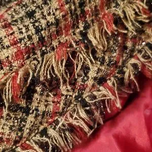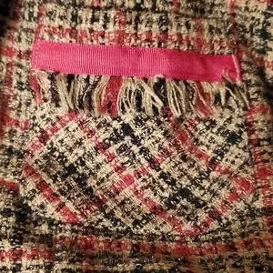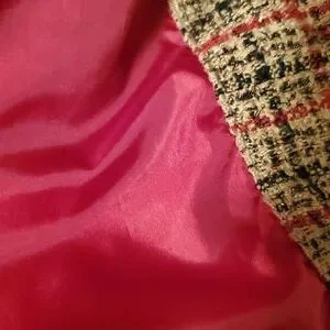 Robert Lewis Womens Lg Tan Beige & Red Suit Jacket Silver Glitter. Large red front buttons. front square pockets.fully lined. Rayon Ramie blend