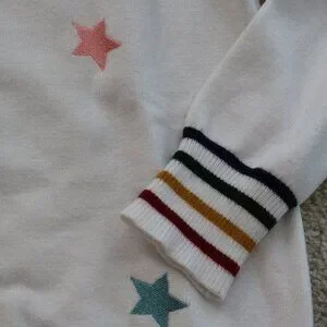 Stylish white sweater with vibrant star patterns. Features a crew neck and striped accents. Ideal for everyday style.