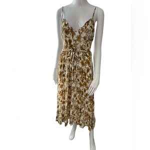 This elegant midi sundress showcases a captivating blend of gold white , offering a chic and sophisticated look. The sleeveless design with spaghetti straps and a v-neckline makes it ideal for casual or resort wear. Its intricate detailing and stylish silhouette ensure you stand out in any relaxed setting.