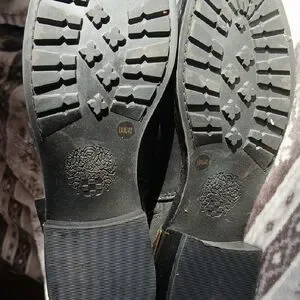 Elegant black boots with quilted design. Features strap and metallic accent. Perfect for fashionable wear.