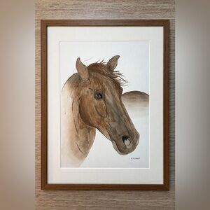 This original 8x10 watercolor painting captures the quiet strength and grace of a beautiful brown horse. Soft washes of warm earth tones blend with delicate linework to highlight the horse’s expressive eye and flowing mane, creating a piece that feels both powerful and serene.