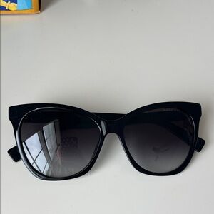 Marc Jacobs black cat eye sunglasses with dark gray lenses and hard case. Sunglasses are in good condition, barely worn. Case has some marks on outside but is perfect inside. Large cat eye look.