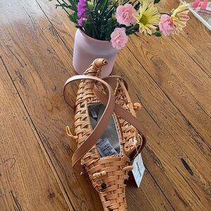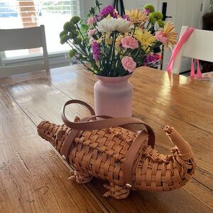 NWT-Unique crocodile-shaped woven clutch. Features sturdy tan handles. Statement piece for your outfit. Dimensions: 14” w, 6” h. Price firm.
