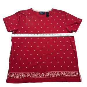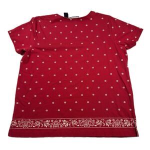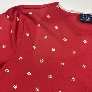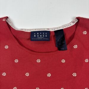 The product is a Crazy Horse Liz Claiborne red top in size XL. This floral pattern blouse is designed for women with short sleeves and made from a blend of polyester and cotton. The basic style and fabric make it a versatile and comfortable addition to any wardrobe, perfect for adding a pop of color to any outfit. Made in Jordan, this top combines quality and style for a fashionable and practical piece.