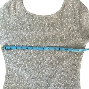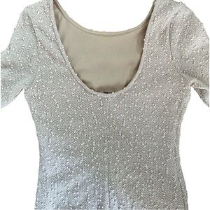 Forever 21 Body con mini-dress, cream coloured with little textured knots and clear sequins all over. Fully lined. Size medium. (Hard to photograph the sequin detail, but really shimmery and pretty) Boat neck with mid-length sleeves. The back has about a 9โ drop. Really cute party dress or for a wedding.