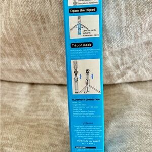 A nice control selfie stick, can use anywhere, can get everyone in the picture. It is black and there’s a button so you could like take the picture. It’s very small to travel with. It goes on Bluetooth.