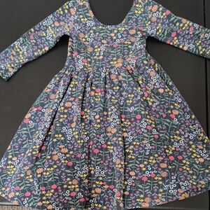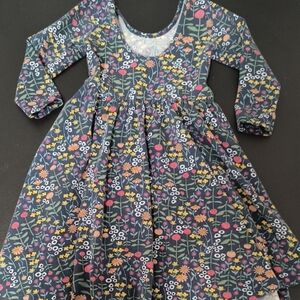 Charming kids dress featuring a vibrant floral print on a blue background. Perfect for casual outings, combining style and comfort.