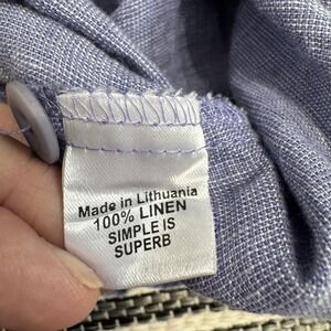 Style and label details: Neck label shows FLAX and size 1G; inner tag notes "Made in Lithuania," "100% LINEN," "SIMPLE IS SUPERB," and RN 114739.