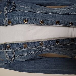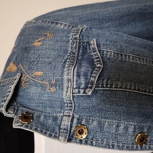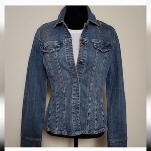 A timeless medium-wash denim jacket in a women’s size Medium, designed with a classic fitted cut and contrast stitching. Features a six-snap front closure and two snap cuffs on each sleeve for an adjustable fit.