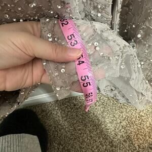 - Excellent pre-owned used condition. Only flaw is a missing beading strand (pictured) at the bottom of the dress. Not in a noticeable spot.