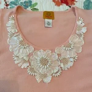 This is a gem in a beautiful shade of pink, a rayon fabric that is light and the most exquisite with flowers accents adorning the curving neckline.