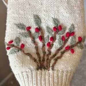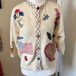 Charming cream cardigan sweater with colorful embroidery. Perfect for adding a touch of whimsy to your wardrobe.