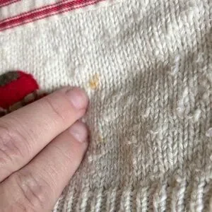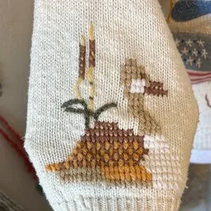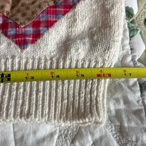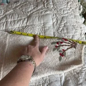 I’d just like to start by pointing out that this sweater is 35 years old. So YAY for clothes that last! It has *absolutely* shrunk over those years, and it is not a size large now. I’m typically a med petite and this sweetie pie is a little bit tight on me. Do with that info what you will; it would be an adorable cropped summer cardigan on someone taller than I.