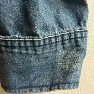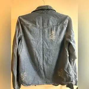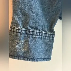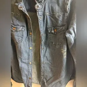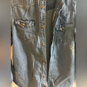 Stylish blue denim shirt. Features button-up front and chest pockets. Ideal for casual wear.