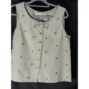The Faded Glory Gingham Green/White Button Up with Tie Front embroidered floral motifs is a stylish and versatile top perfect for various occasions such as travel, casual outings, and workwear. This sleeveless top features a scoop neckline, wide straps, and a tie-neck closure. Made from lightweight and breathable chambray fabric, this top is easy to care for with machine washable instructions. The embroidered floral motifs add a touch of charm to this classic fit top, ideal for the summer, fall, and spring seasons. Item# BM865