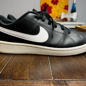 These are a pair of black Nike Court Royale 2 Low sneakers, which feature a leather upper and a white retro Swoosh design. They are in great condition with minimal wear. There is a slight discoloration on the white sole, see pictures.