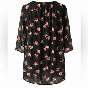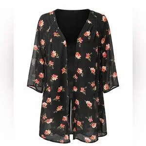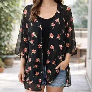 Chic sheer cardigan featuring vibrant red floral accents. Perfect for stylish layering.