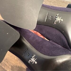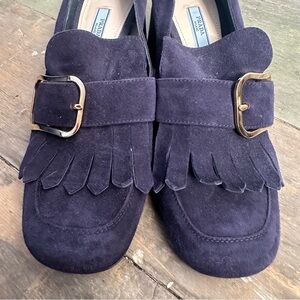 Prada Suede Fringe Buckle Chunky Loafer Heels