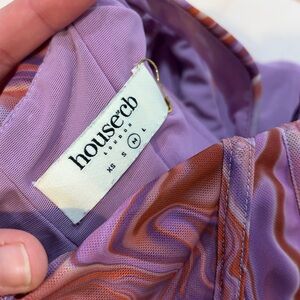 Stylish crop top with a swirl pattern. Features shades of purple and red.