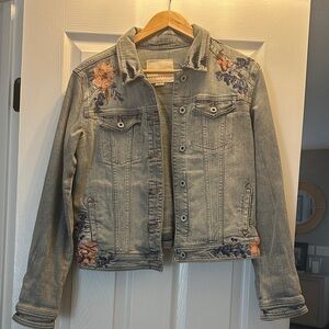 Stylish denim jacket with floral embroidery. Lightly distressed. Perfect for adding a touch of elegance to any outfit.