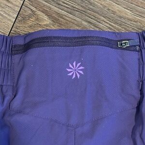 Elevate your run with these Athleta 2-in-1 running shorts, combining style and functionality in a size Small. Featuring a convenient back zip pocket, these shorts are perfect for storing your essentials while you focus on your fitness.