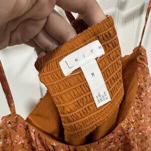 Add a pop of color to your summer wardrobe with this Leith Sun Dress in size medium. The dress features a beautiful floral pattern in vibrant orange with spaghetti straps that cross at the back. Perfect for a casual occasion, the dress has a short length and is adorned with cute strap accents.