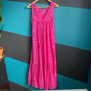 Bright pink maxi dress with intricate patterns. Sleeveless design. Perfect for summer outings.