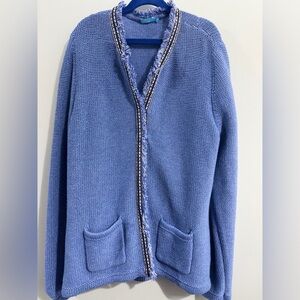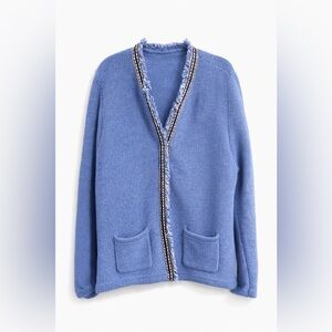 J.McLaughlin Blue Textured Knit Cardigan Fringe Trim Open Front Pockets Size L