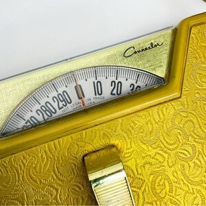 Vintage Counselor bathroom scale with a textured harvest gold floral pattern—a standout piece of Mid-Century Modern décor. This sun-warmed yellow scale adds instant retro charm to bathrooms or dressing areas.