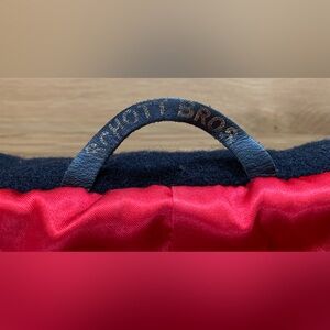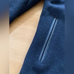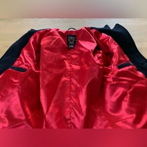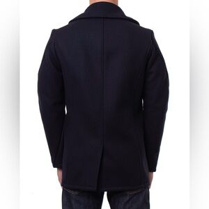 Gorgeous Schott black wool peacoat with black leather trim and black anchor buttons. Very thick, warm, high quality material—classic American craftsmanship. Amazing piece in excellent condition. Size 38.