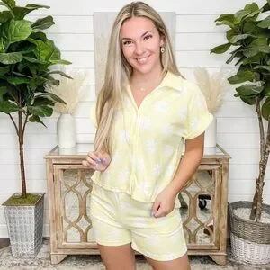 White Birch “It’s No Bother” Yellow with Daisies Terrycloth Button Down Shirt