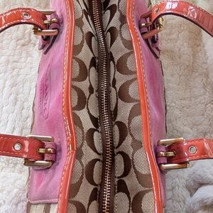 Stylish Coach shoulder bag with signature pattern. Features pink accents and durable design. Perfect for everyday use. She is missing her tag but has so much life left. She's been cleaned and conditioned. Would be great for a collector or a first purse. See pictures for call outs.