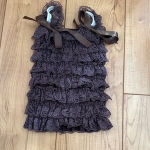 Adorable kids fall outfit featuring a brown ruffled top and an orange and brown tutu skirt with sunflower accent. Perfect for dress-up and special occasions. Wear for fall pictures, pumpkin picking or as a Thanksgiving outfit! One size fits most babies ages 9 months- 2 years. Stretchy material grows with baby.