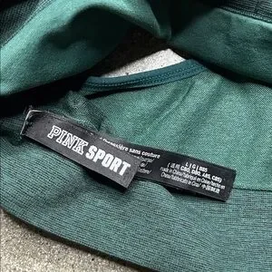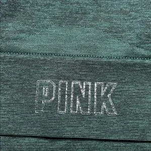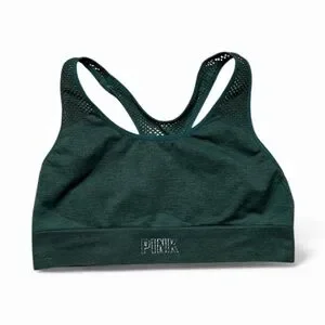 Victoria’s Secret PINK Comfortable green sports bra with mesh details on the back of the item. Features PINK logo on the front of the item which has wear and tear as seen in photos. The item does not have the pads they have been removed. Overall item has a lot of life left.