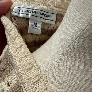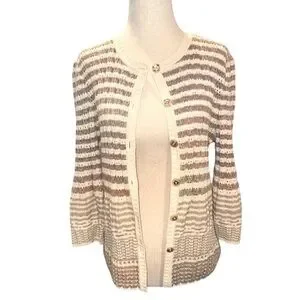 Vintage knit 3/4 sleeve cardigan with horizontal stripes but vertically ribbed. Colors are a beautiful. Hints of light blue and purple, but overall is cream and white. I love the knitting so much. Buttons are adorned with St. John engraving. Old money coastal grandma vibes.