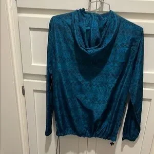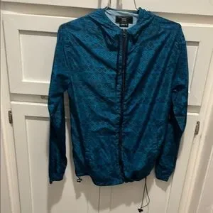 Stylish blue windbreaker jacket with a geometric pattern. Perfect for casual outings.