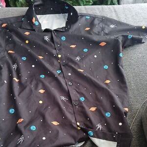 Explore the cosmos with this stylish black space-themed shirt. Perfect for casual outings or themed events.