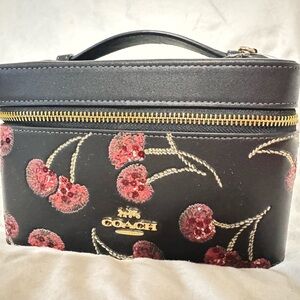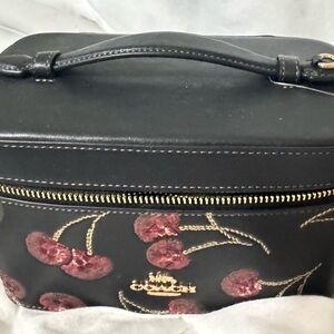 Coach leather cosmetic case black with vibrant red cherry's accents top handle. Features a sleek black design and gold zipper close and interior mirror NWT