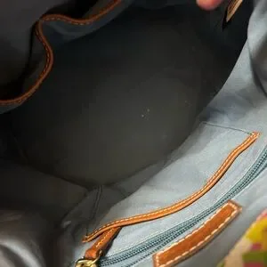 Vibrant pink bag with floral design. Brown leather accents. Drawstring closure. Perfect for any occasion. I carried it only a few times. There are a few stuffs on the leather on the edges and some lint/debris inside I have not been able to get out as of yet. Otherwise it looks so good! Great for Spring! Lots of room for all you need to take with you on a trip to the beach or wherever!